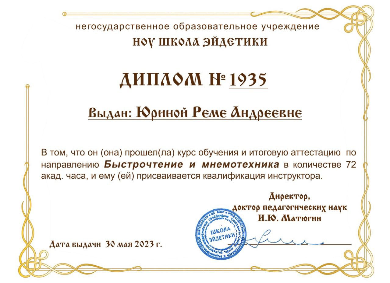Дорогая Рема Андреевна, хочу выразить вам благодарность за ваш труд и профессионализм! Моя дочь посещала уроки по скорочтению на протяжении года. Результат - увеличение скорости чтения, повысилась концентрация внимания, улучшилась память! Спасибо вам огромное!!!